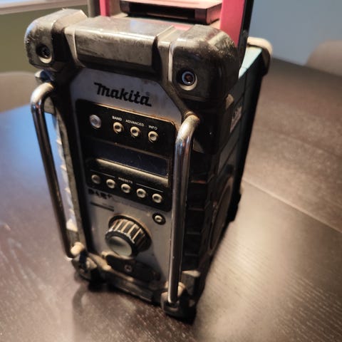 Selger en solid Makita DMR105 byggradio. Dette er en velkjent og slitesterk radio som er laget for røff bruk på byggeplass, i garasje eller verksted.