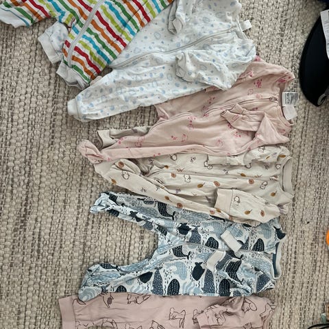 Selger fem pent brukte pysjer i str 62. En med fot, to uten fot, og to "pysjposer" hvor beina kan sparke fritt inni.
