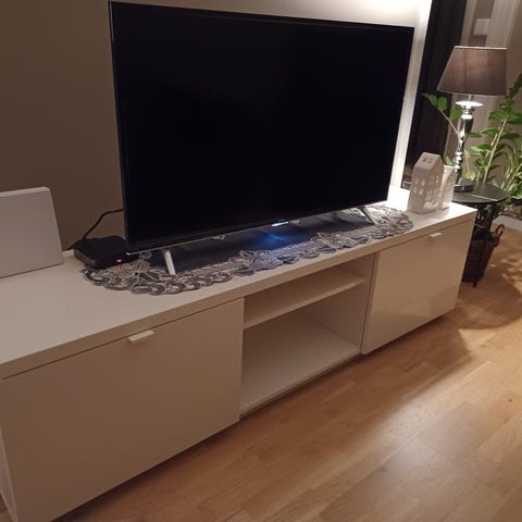 Brukt som tv-benk og det er derfor hull til ledninger inne i høyre skap ☺️