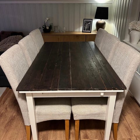 Hele og pene stoler ,45cm sittehøyde,total høyde på rygg er 82cm. Farge er mørk lilla med gull fargede bein. Pris er for alle 8 stolene.