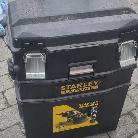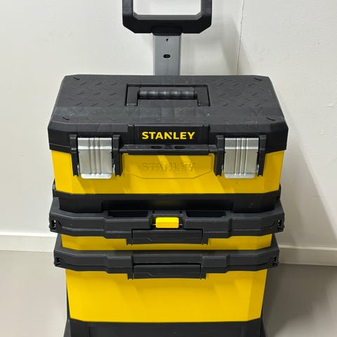 Selger en solid Stanley verktøykasse med flere uttrekkbare skuffer og topprom. Praktisk løsning for oppbevaring av verktøy, skruer, smådeler og annet utstyr.