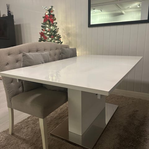 8 hvite stoler med mørkegrå seter. Noen bruksmerker og noen trenger å strammes litt, ellers i god tilstand. Selges samlet for 400 kr grunnet flytting.