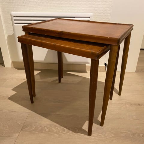 Sett med 3 bord laget i tre. Bordene har et mønstret bordplate-design og buede ben. Passer til bruk som sidebord eller små bord i stue eller andre rom.