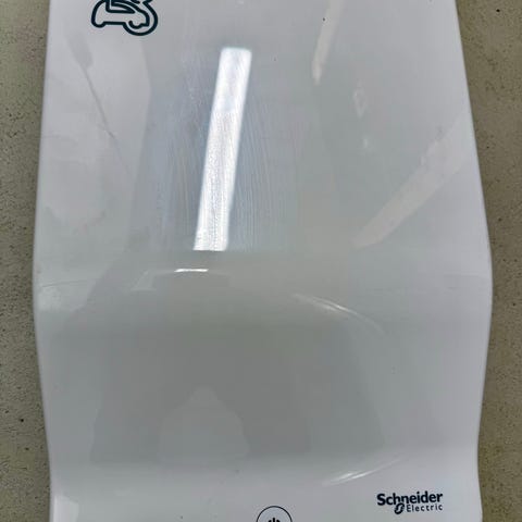 Schneider Electric EVlink ladeboks for elbil med hvit farge. Ladeboksen er designet for lading av elbiler og har tilkoblingskabel for strøm. Produktet har en kompakt og funksjonell utforming med kontrollpanel for lading.