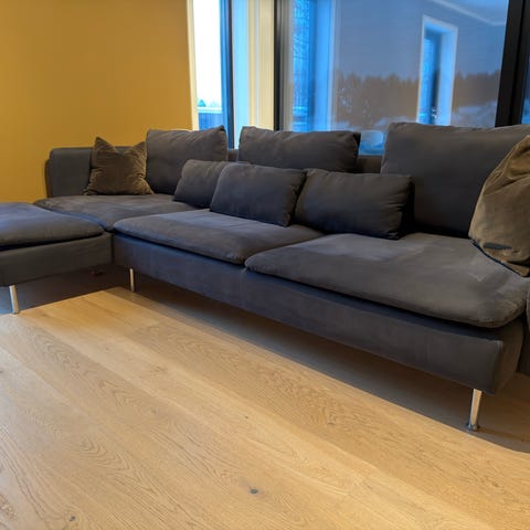 Selger pent brukt SÖDERHAMN 3-seters sofa med armlener i fargen Hillared beige. Du kan velge mellom ben i fargen krom eller eik. Pent brukt, kun brukt til boligstyling og derfor pen i passformen.