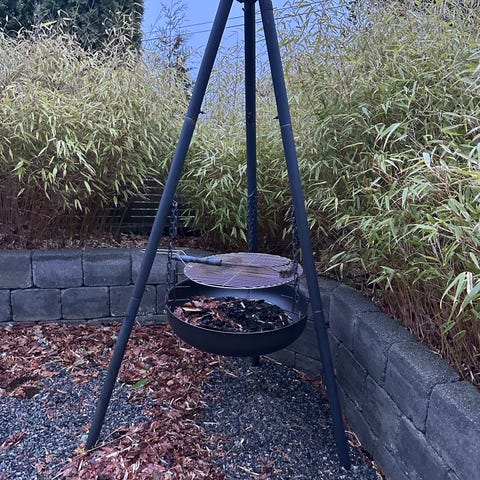 Espegard bålpanne med grillrist og stativ i metall, farge svart. Produktet er egnet til bruk utendørs i hage, på terrasse eller hytteområde.