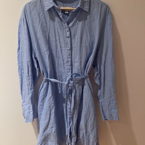 Kjole i linblanding, med lommer, dyp V-urringning og knyting foran. Størrelse 38, normal i størrelsen. Litt tykkere stoff en vanlig linkjoler, veldig behagelig å gå i! Får bare ikke brukt den nok.