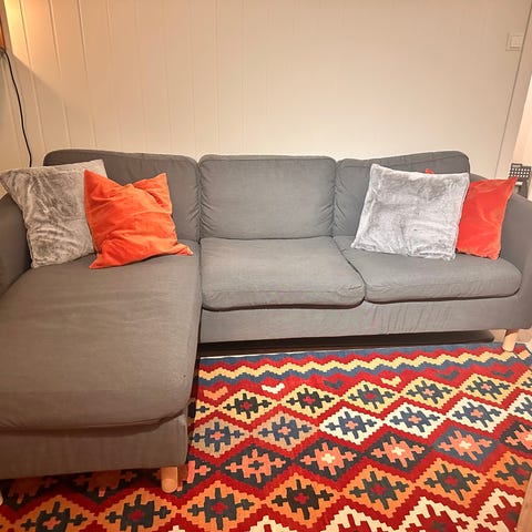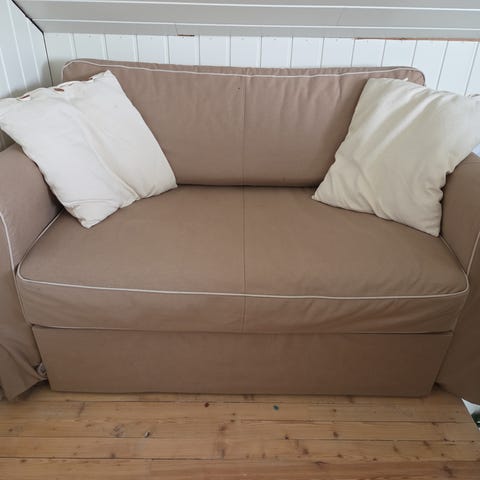Sjeslong med puter og oppbevaring selges. Kan også brukes som en stor puff eller som hjørnesofa i et lite rom. Stoffen på den ene siden er revet, se bilde.