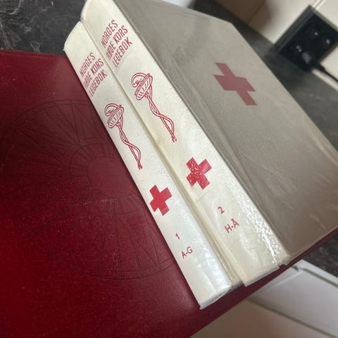 Norges Røde Kors Legebok i to bind, alfabetisk sortert med bokstavene A-G og H-Å. Bøkene har rødt kors-symbol på omslaget og inneholder medisinsk informasjon.