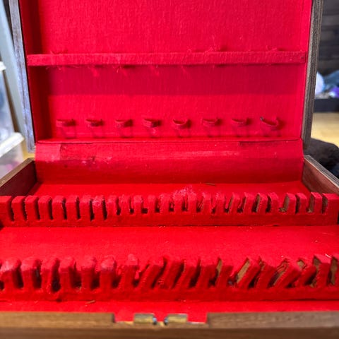Skjeene er 11 cm lange og veier til sammen 27 gram. Selges for kr. 750 pluss porto.