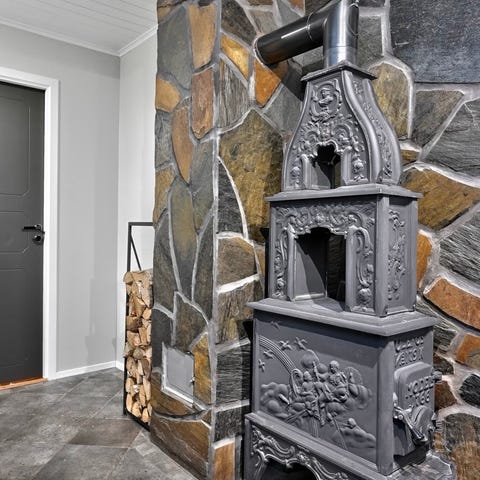 Gammel ovn laget i støpejern med dekorative detaljer. Designet for oppvarming og muligens matlaging. Har en dør med håndtak og en pipe tilkobling bak. Farge: mørk grå/svart. Materiale: støpejern.