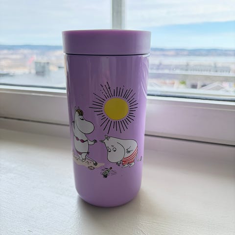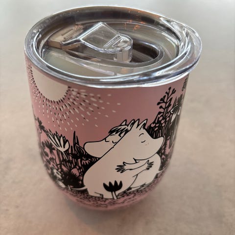 Dette er en Moomin Arabia Mooments termokopp med "Storm" motiv.