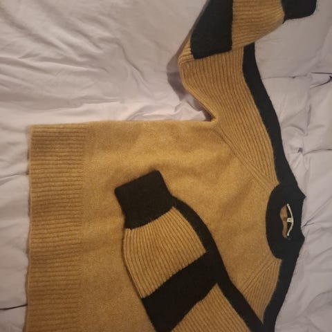 Second Female S/36 strikke genser, kamel farge, lys brun. Brukt pent bare 1 gang, håndvasket ull vask, er som helt ny, ingen skader. Myk, elastisk og varm materiale: 34% mohair, 34% ull, 27% polyamid, 5% elastane. Lengde foran ca 58 cm og bak litt lengre 62 cm, liten split nederst på hver side i ribbe kanten. Se bilder for mere mål og nærmere beskrivelse. Kan hentes Nydalen i Oslo etter avtale, Vipps oppgjør eller sendes Fiksferdig i posten.