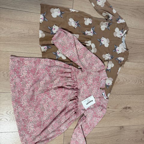Str 98/104 og 110/116 - brukt ca ved 4-5 år. Godt brukt, se bilder. Et lite hull i den stripete buksen.