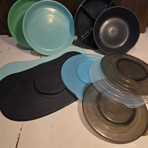 Fat og skåler kan med lokket på festes sammen oppå hverandre.
