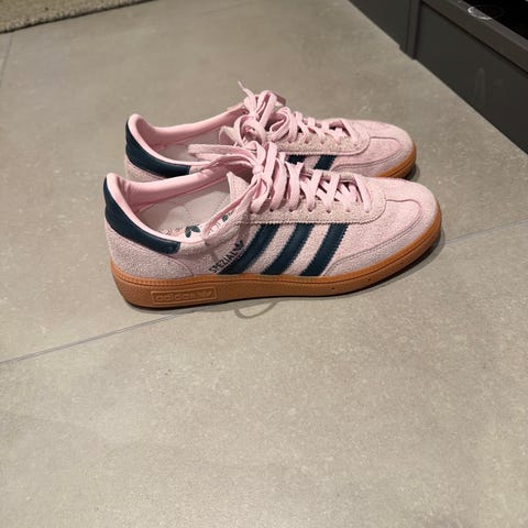 Adidas sneakers joggesko i størrelse 40 2/3. Skoene har en lys blå og beige fargekombinasjon med klassiske Adidas-striper.