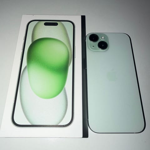 Apple iPhone 15 mobiltelefon med 128 GB lagringskapasitet i svart farge. Telefonen har en batteritilstand på 85 % kapasitet. Leveres med beskyttelsesdeksel.