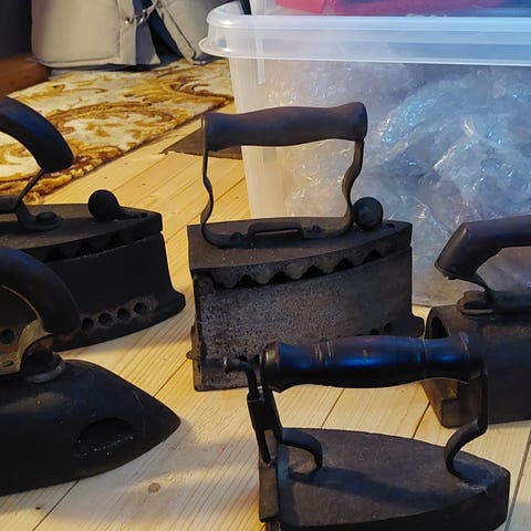 Pent gammelt jern med tilhørende stativ. No 4. Vipps ok.