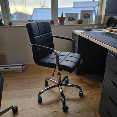 Kontorsstol fra Fagmøbler i beige stoff med armlener og hjul. Stolen har justerbar høyde og en roterbar base med fem hjul for mobilitet. Egnet for bruk ved skrivebord eller kontorarbeid. Kjøpt ny for 2 måneder siden.