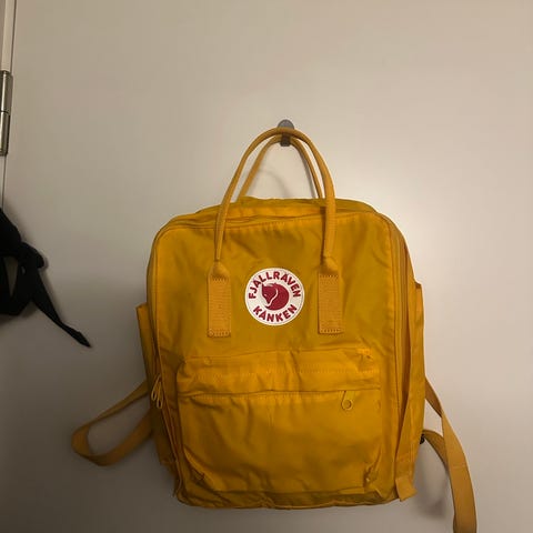 Fjällräven Kånken ryggsekk laget av stoff i gul farge. Designet for unisex bruk, egnet til daglig bruk og ulike utendørsaktiviteter.