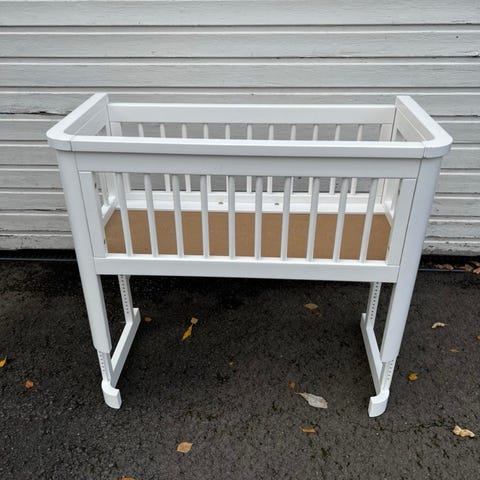 Troll bedside crib til salgs. Perfekt designet for å plasseres ved siden av foreldreseng for enkel tilgang til barnet. Laget i hvit farge med solide materialer, og har hjul for enkel flytting og justerbare sider for sikkerhet og funksjonalitet.