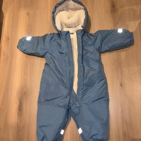 H&M vinterdress for barn i størrelse 80, farge rød, laget av polyester. Passer for både gutter og jenter. Dressen har hette og glidelås foran, samt reflekser på bena for økt synlighet. Materialet er slitesterkt og egnet for kalde værforhold.