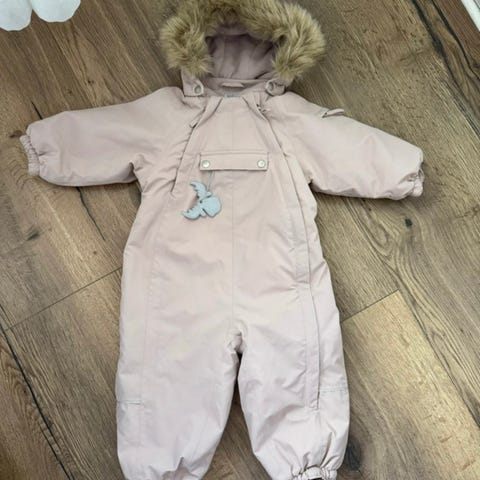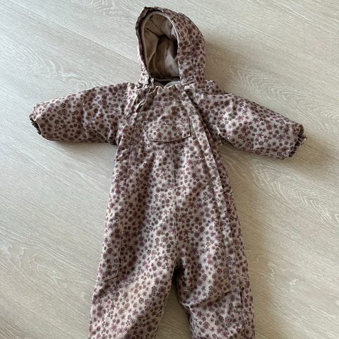 Wheat barnedress i størrelse 80 for jente. Dressen er lyserosa med blomstermønster. Den har hette og hel glidelås foran. Materialet består av 100% polyester med polstring og fôr også i polyester.