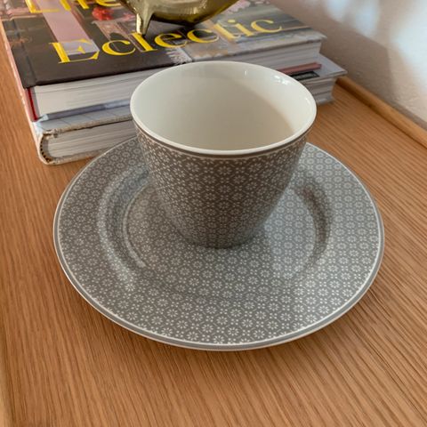 6 kaffekopper med skål, 5 middagstallerkener, 5 litt mindre tallerkner og 5 skåler. Fargen er grå.