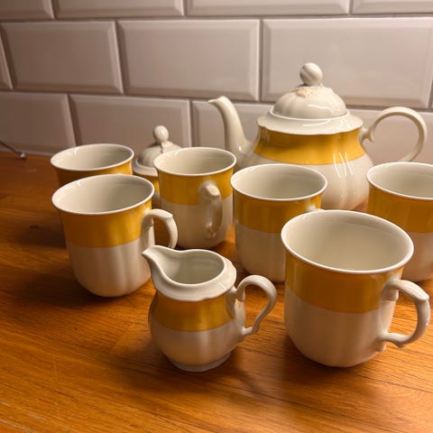 Kaffeservise til 16 personer, inkl fløtemugge og sukkerskål, samt 2 store tekoppen.