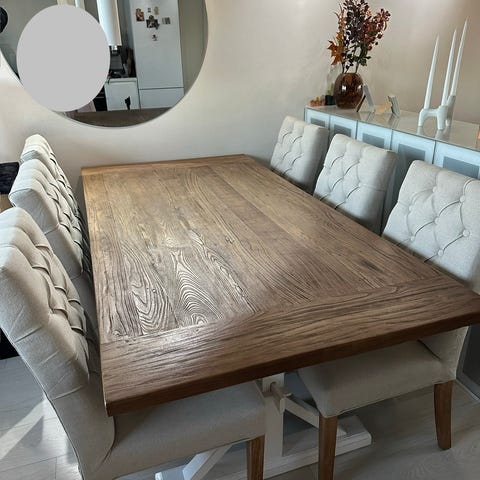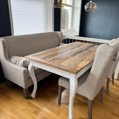 Bordet er i fin stand, 220cm lang og 90 cm bredt, kjøpt på B&B 2024. De grå stolene er ganske slitte og kort på av katt. Bruke stoler er i velour og er i fin stand.