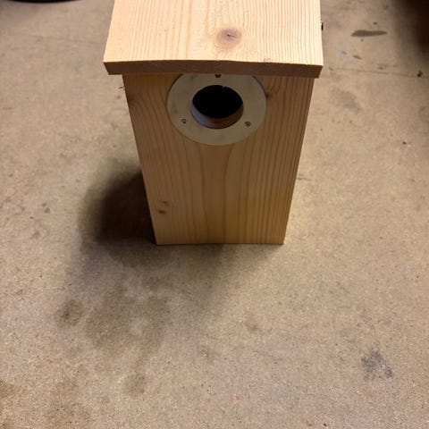 Fuglekasse til å montere kamera i . Brent med metalring for åt hakkespett ikke skal hakke inflygins hullet større. Kassene kan også spesial bestilles . Kassene kan sendes I posten mot kjøper betaler porto, Eller hentes på min adresse .