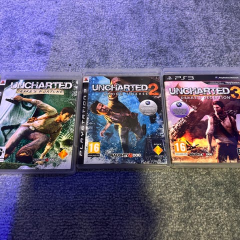 Uncharted, Uncharted 2 og Uncharted 3 selges samlet. To er uten manual.