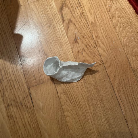 Håndlagde figurer laget av leire i ulike former, inkludert en ansiktsfigur, et hjerte og en rund form. Disse kan brukes til dekorasjon eller som små kunstprosjekter.