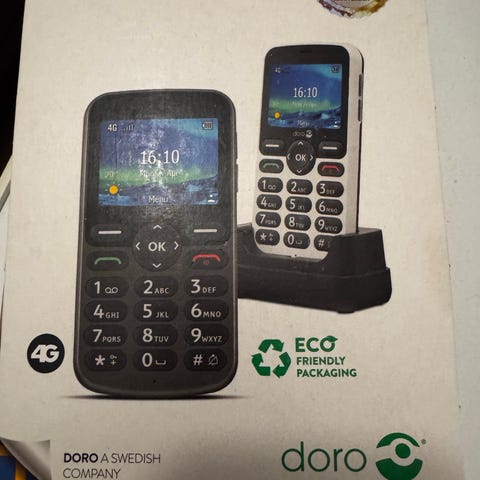 Doro telefon selges 600,-. 4G. Kjøpt ny i juli 2025. Ubetydelig brukt. Ligger i original esken. Kvittering vedlagt.