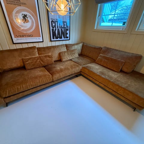 Godt brukt IKEA VIMLE 5-seter sofa med sjeselong fra 2020 selges billig mot henting. Selges grunnet kjøp av ny sofa. Sofaen kan monteres slik du vil (modul). Sjeselongen kan åpnes og brukes som oppbevaring. Kommer med trekk Ledje grå/svart, men anbefales å kjøpe nytt trekk da det er kloremerker etter katt på den (se bilde). Har vært i kontakt med dyr!