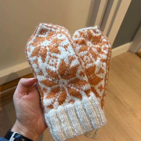 3 par hjemmestrikkede selbuvotter selges. Kan selges samlet for 400 kr, eller hver for seg for 150 kr. Ulike farger, men ca samme størrelse (Medium dame).