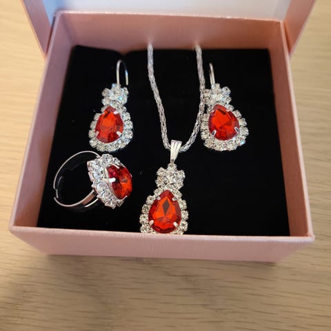 Smykkesett med smykke, armbånd og ring. Uekte. Ser ut til å være en type metall, men vet ikke hvilket materialet. Armringen og ringen kan reguleres. Et par bruksmerker på armringen. Selges samlet for kr 120