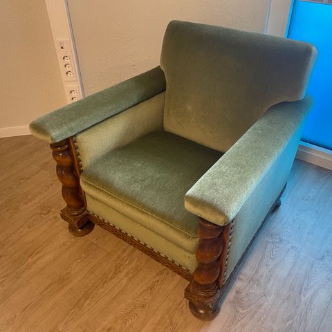 En pyntesnor har delvis løsnet (se siste bilde). Dette er en kosmetisk detalj og påvirker ikke funksjon eller komfort. Sofaen er ellers hel, stabil og med god spenst i fjærene.