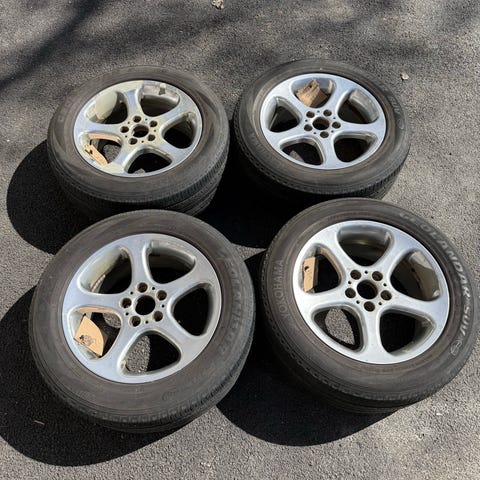 Selger et komplett hjulsett med originale Mercedes-Benz aluminiumsfelger, levert med helt nye sommerdekk.