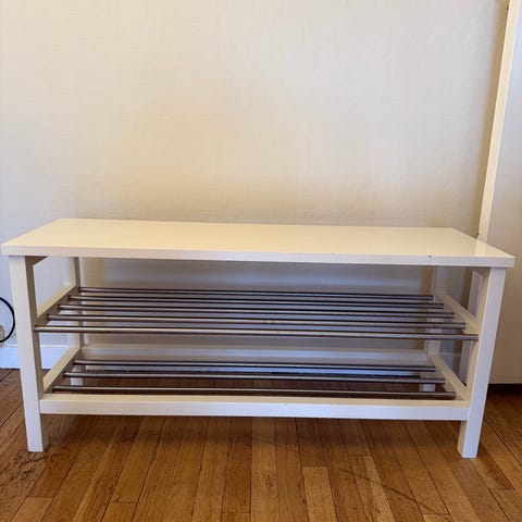 Pent brukt skohylle. Hvitmalt med to hyller bestående av metallstenger. Kan stables. Må hentes.