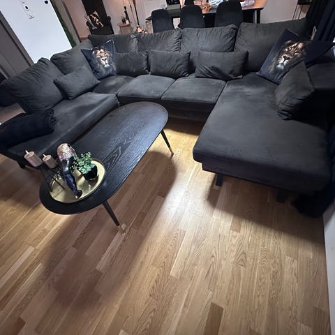 Pent brukt Harper sofa med sjeselong og valnøttbein fra Sofa Company selges til under halv pris. Kjøpt ny i 2021.
