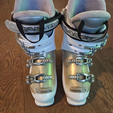 Alpinskistøvler i hvit og lilla farge. Støvlene har størrelse 20,5 og er designet for bruk på alpinski.