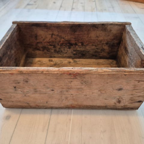 Gammel A/L Hedemarksmeieriet trekasse med tekst på sidene. Kassen er laget av tre. Den kan brukes til oppbevaring eller dekorasjon.