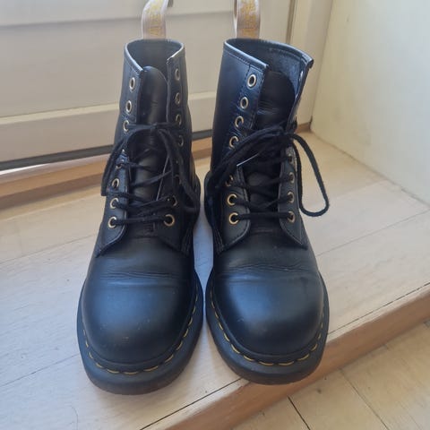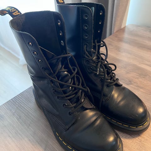 Dr. Martens støvler i størrelse 41, svart. Utførelse i matt lær, med snøring foran og stålhette. Utrolig kule boots, men dessverre passer de ikke.