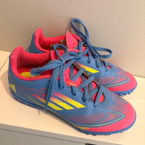 Adidas F5 fotballsko i blått, rosa og gult. Designet for barn med knotter på yttersålen for bedre grep på kunstgress og gress. Skoene har snøring for justerbar passform og er laget i syntetiske materialer for slitestyrke.