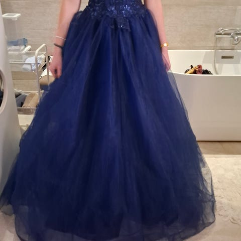 Selger en nydelig lys blå ballkjole kjøpt hos Pandoras på Fevik. Kjolen er brukt kun én gang og er renset på vaskeri, så den fremstår som helt ny.
