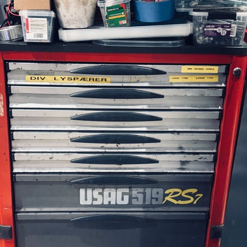 AST Innredninger verktøyskap med flere skuffer i metall. Skapet er designet for oppbevaring og organisering av verktøy og smådeler. Skuffene har varierende størrelse og er egnet for bruk i verksteder eller lignende miljøer. Har vært montert i Transporter varebil