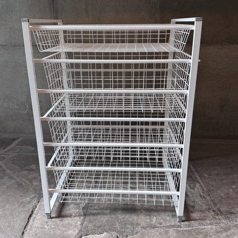- 2 stk høye trådkurvstativ med 6 kurver og topplate, kr. 300 pr/stk