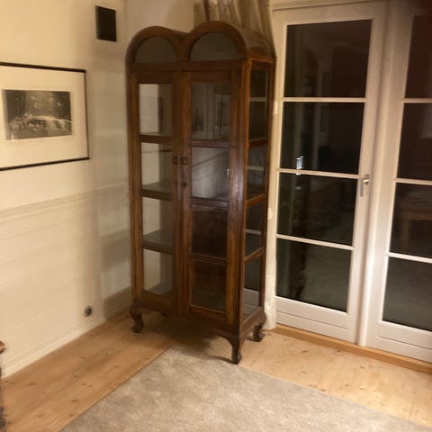 Pent mørkbeiset Beito bokskap/vitrineskap med 2 skuffer, 3 hylleplater og glassdører.