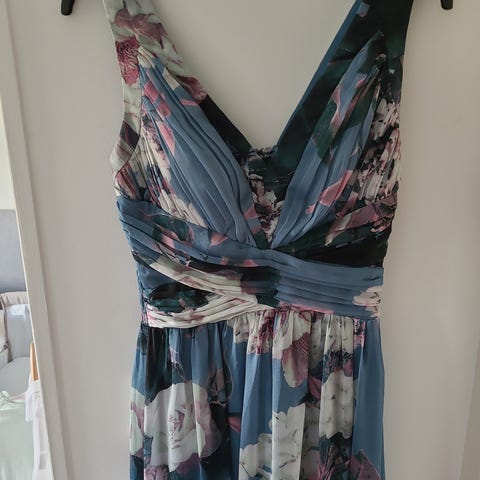 Kjole i en nydelig grønn farge, brukt i bryllup en gang. Noe slitasje nederst, da jeg er litt kort og den derfor har subbet i bakken. Brukt en gang.